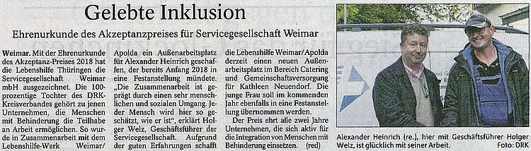 Akzeptanzpreis für die Servicegesellschaft Weimar mbH